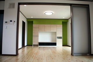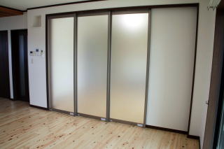 ダイニングとリビングの間仕切、エヤコンの効率を考えられた施主様の提案で採用、ただ普段使いは開放の模様